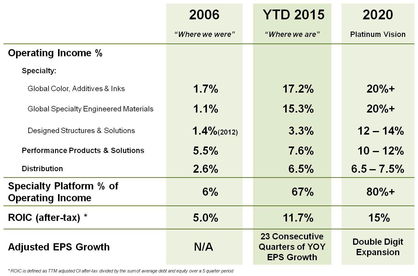 Specialty Platform consists of our three specialty segments: Global Specialty Engineered Materials; Global Color, Additives and Inks; and Designed Structures and Solutions. We present Specialty Platform sales, gross margin, selling and administration, and operating income because management believes that this is useful information to investors by highlighting our collective progress in advancing our specialization strategy. |